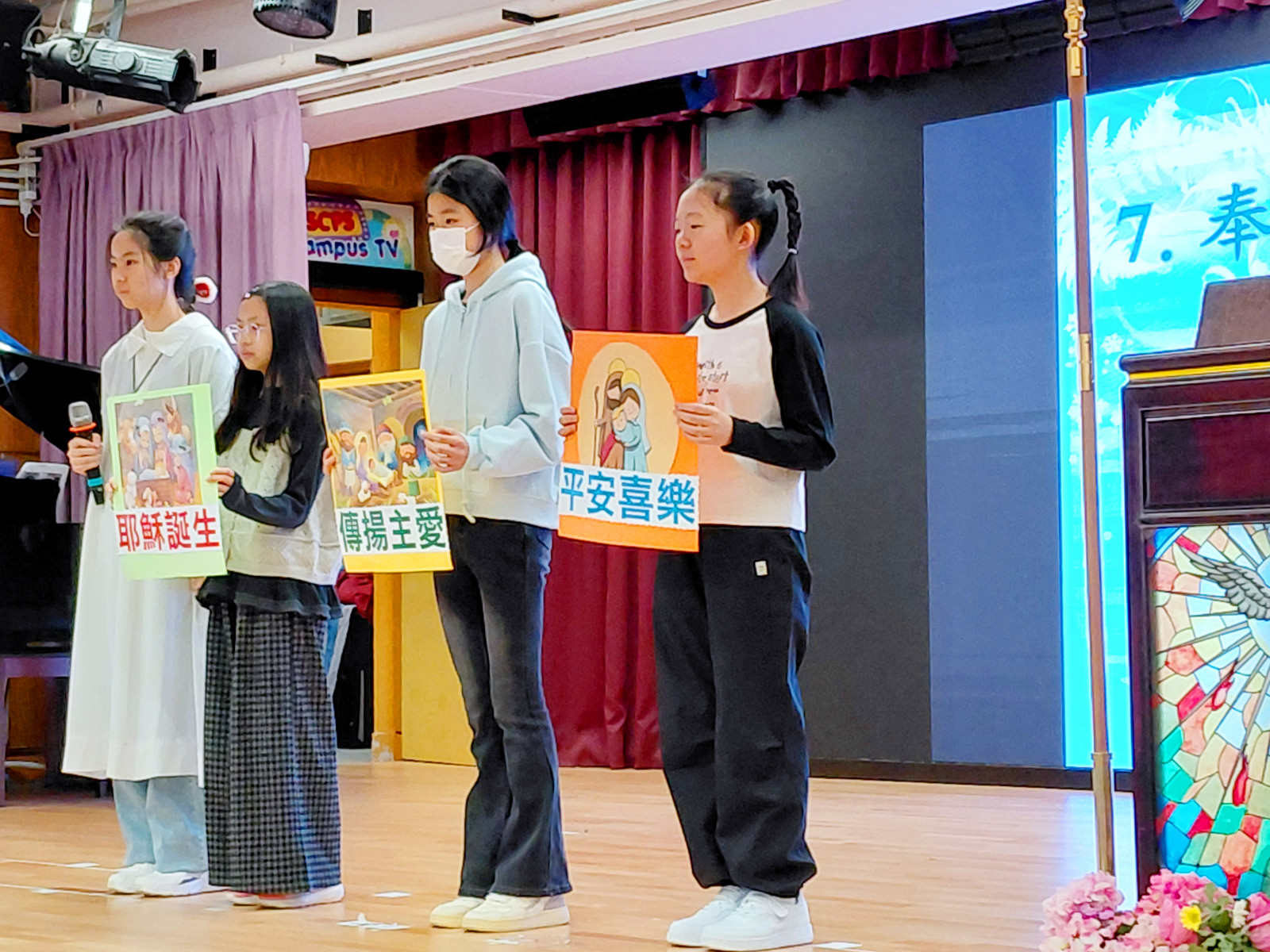 祈禱聚會奉獻中,學生代表奉獻預先製作「耶穌誕生」、「傳揚主愛」及「平安喜樂」的標語圖,他們承諾在生活中效法耶穌,將愛帶到人間,亦會關心身邊的人,讓眾人得享平安與喜樂。